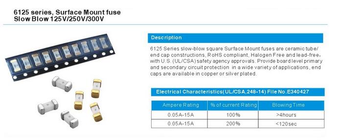 產(chǎn)品名稱: 6125貼片慢斷125V/250V/300V保險(xiǎn)絲