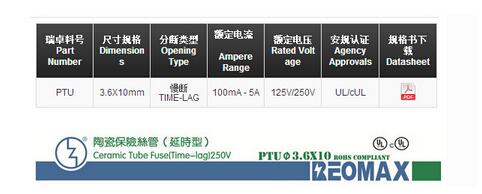 產(chǎn)品名稱: PTU 3.6*10陶瓷慢斷保險(xiǎn)絲