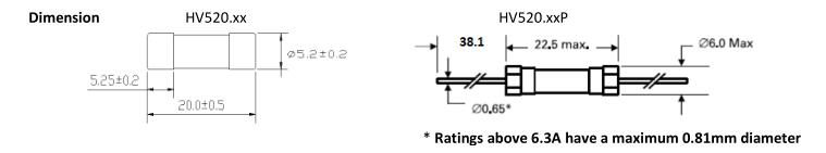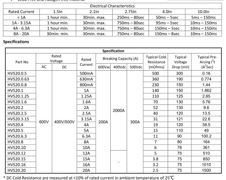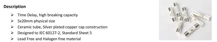 簡(jiǎn)述: 5x20 fuse, according to IEC 60127-2, Time delay fuse. VOLTAGE RANGE: 600VAC, 400V/500V DC AMPERE RANGE: 500mA ~ 20A INTERRUPTING RATING: 500mA-20A 200A@600Vac 500mA-10A 2000A@400Vdc 12A-20A 300A@500Vdc