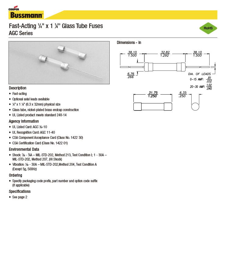 產(chǎn)品名稱: bussmann 快斷保險絲 AGC系列6.3*32mm 玻璃保險絲