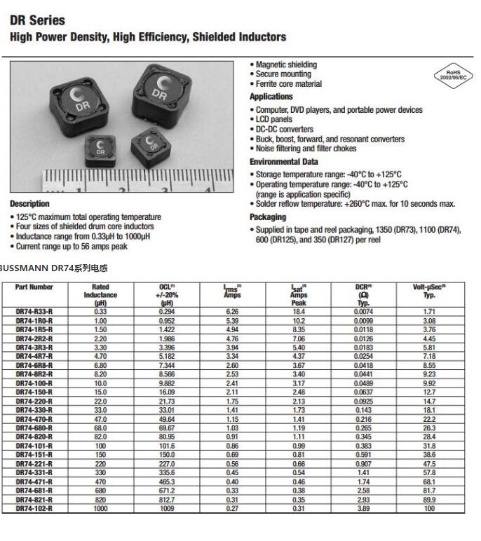 產(chǎn)品名稱: BUSSMANN DR74系列電感