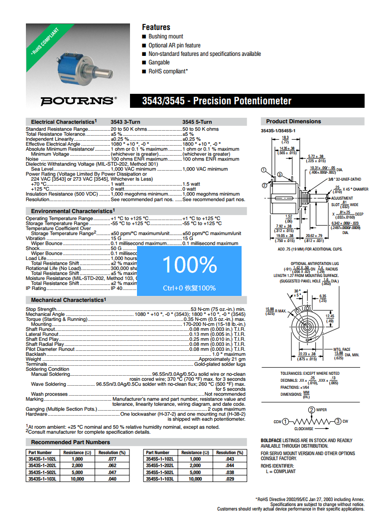 產品名稱: BOURNS多轉型精密電位器3543/3545