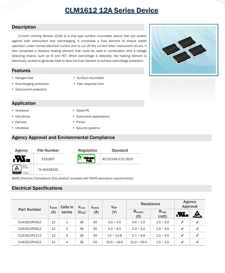 產(chǎn)品名稱: CLM1612 12A Series Device 三端保險絲