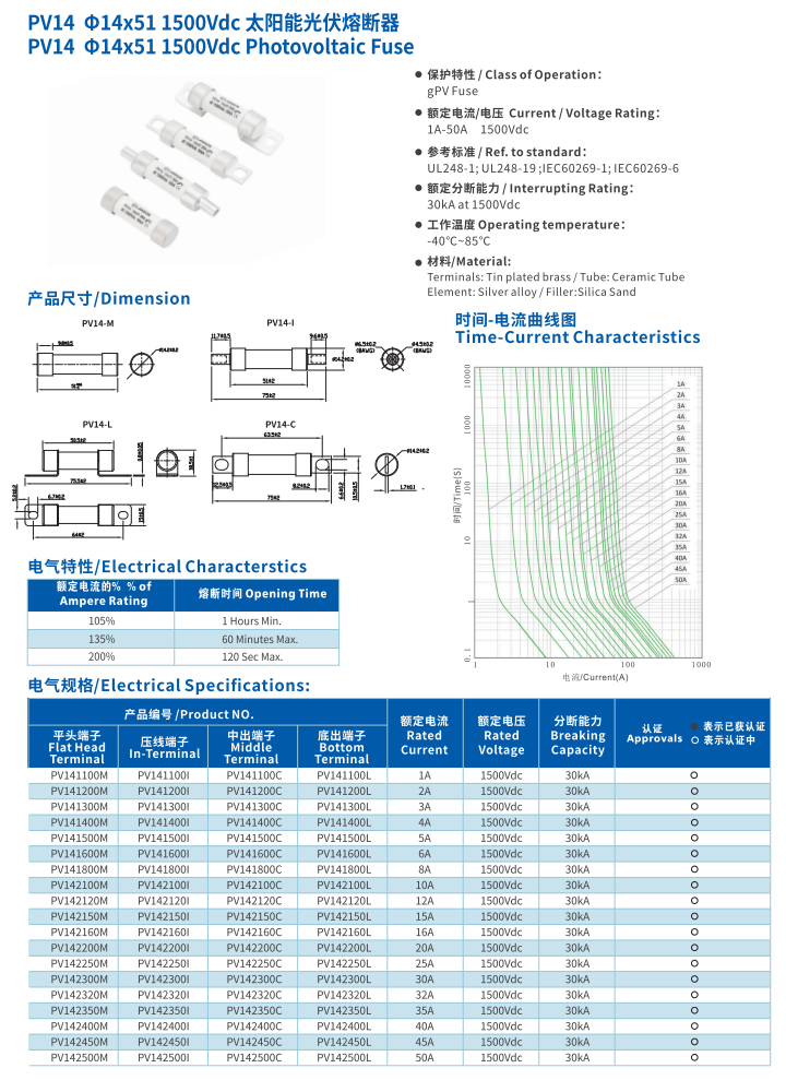 產(chǎn)品名稱: 太陽能光伏熔斷器 PV 14*51 1500VDC Photovoltaic Fuse