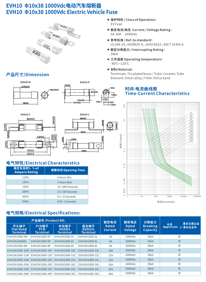 產(chǎn)品名稱: 電動汽車熔斷器EVH10 10*38 1000VDC Electric Vehicle Fuse