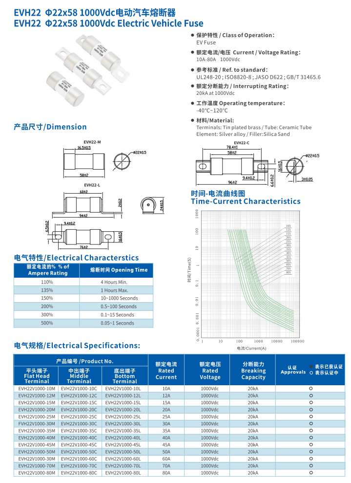 產(chǎn)品名稱: 電動汽車熔斷器EVH22 22*58 1000VDC Electric Vehicle Fuse