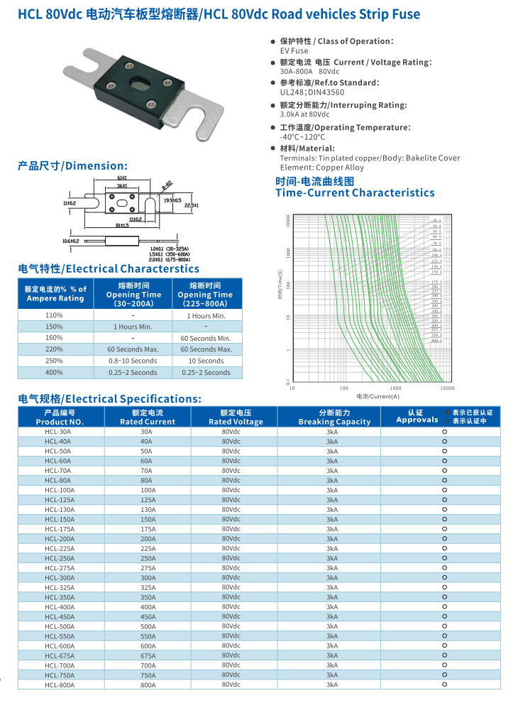 產(chǎn)品名稱: 電動汽車板型熔斷器HCL 80VDC Road vehiles Strip Fuse