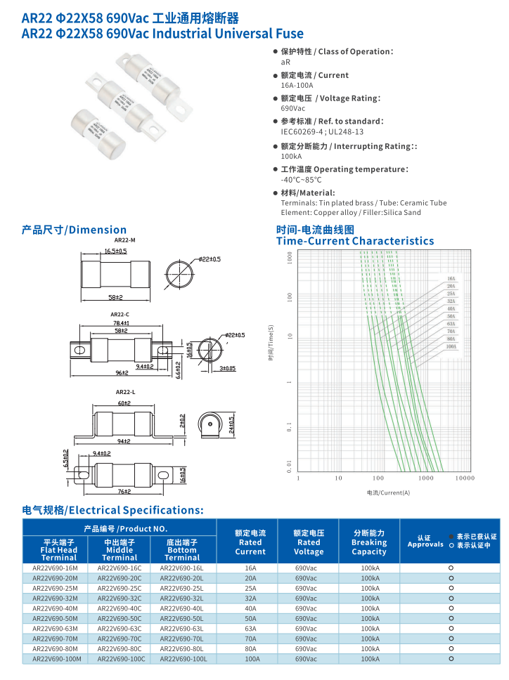 產(chǎn)品名稱: 工業(yè)通用熔斷器 AR22 22*58 690VAC INDUSTRIAL Universal Fuse